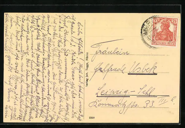 Personenbezogene Daten auf der Rückseite der Karte wurden durch blauen Textmarker unkenntlich gemacht. Die blauen Stellen sind auf die Vorderseite durchgeweicht und wirken sich negativ auf das Postkartenfoto aus