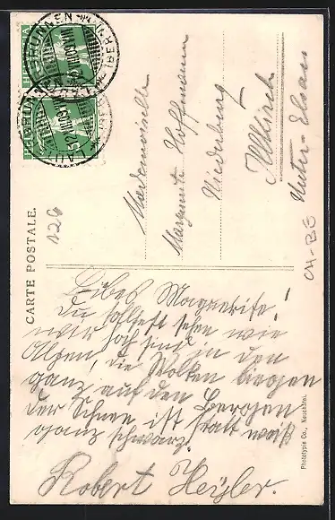 Personenbezogene Daten auf der Rückseite der Karte wurden durch blauen Textmarker unkenntlich gemacht. Die blauen Stellen sind auf die Vorderseite durchgeweicht und wirken sich negativ auf das Postkartenfoto aus