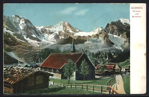 AK Mürren, Kirchpartie mit Blick auf das Breithorn