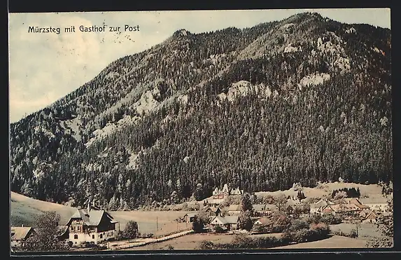AK Mürzsteg, Gasthof zu Post vor Berghintergrund