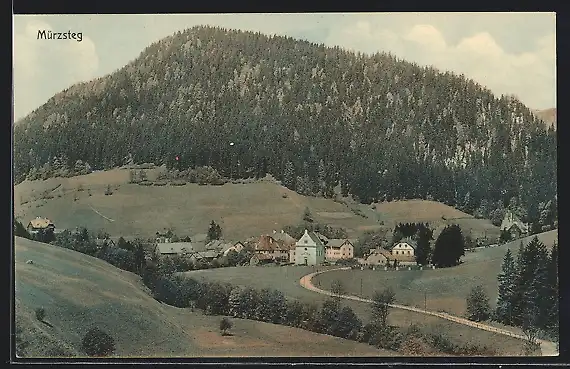 AK Mürzsteg, Totalansicht mit bewaldetem Berg