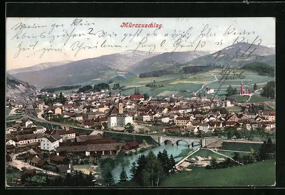AK Mürzzuschlag, Ortspartie mit Brücke
