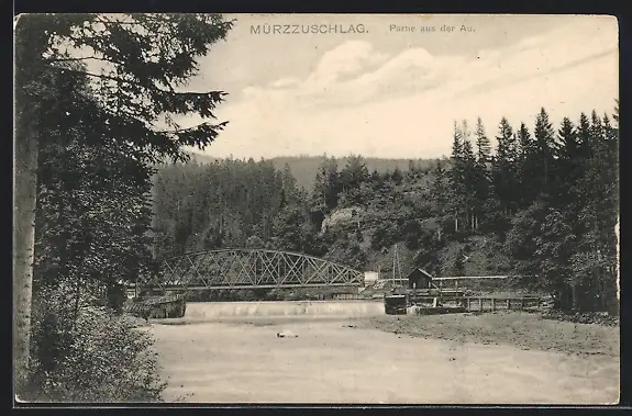 AK Mürzzuschlag, Partie aus der Au mit Brücke