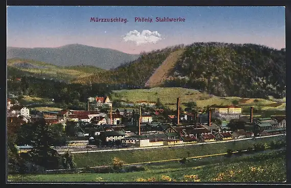 AK Mürzzuschlag, Phönix Stahlwerke mit Umgebung aus der Vogelschau