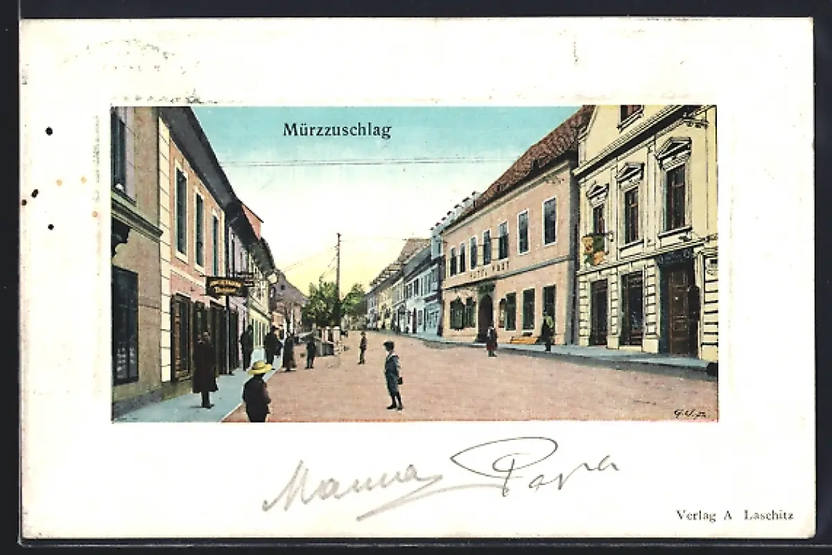 AK Mürzzuschlag, Strassenpartie mit Geschäften