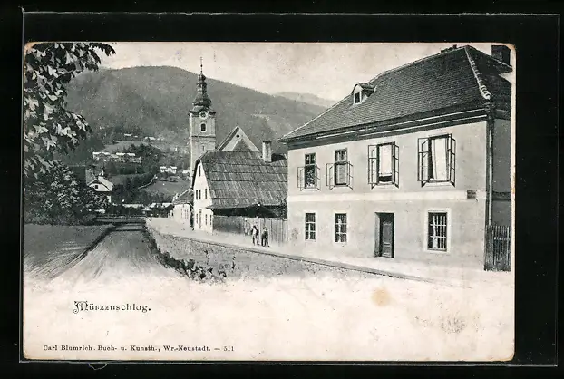 AK Mürzzuschlag, Strassenpartie mit Kirchturm