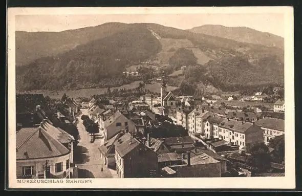 AK Mürzzuschlag, Teilansicht des Ortes mit Berg