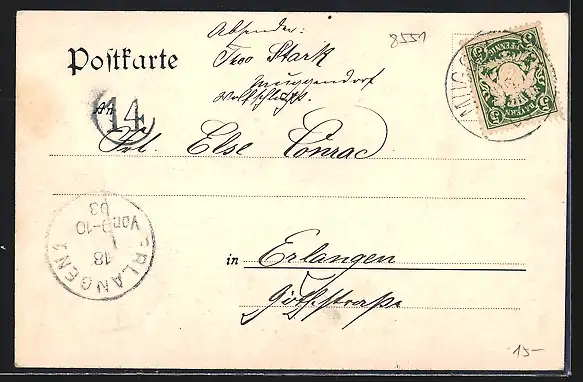 alte Ansichtskarte, gelaufen 1903, Bugspur li. oben, guter Zustand