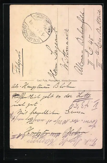 Personenbezogene Daten auf der Rückseite der Karte wurden durch blauen Textmarker unkenntlich gemacht. Die blauen Stellen sind auf die Vorderseite durchgeweicht und wirken sich negativ auf das Postkartenfoto aus