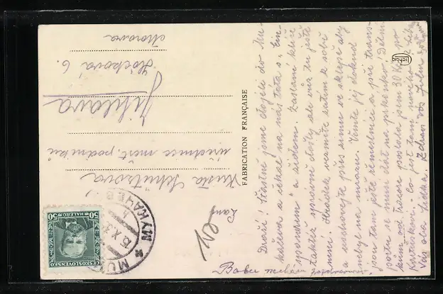 Personenbezogene Daten auf der Rückseite der Karte wurden durch blauen Textmarker unkenntlich gemacht. Die blauen Stellen sind auf die Vorderseite durchgeweicht und wirken sich negativ auf das Postkartenfoto aus