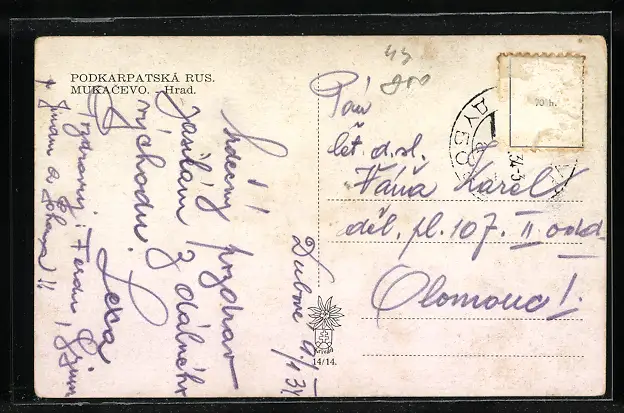 Personenbezogene Daten auf der Rückseite der Karte wurden durch blauen Textmarker unkenntlich gemacht. Die blauen Stellen sind auf die Vorderseite durchgeweicht und wirken sich negativ auf das Postkartenfoto aus