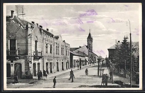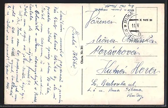 Personenbezogene Daten auf der Rückseite der Karte wurden durch blauen Textmarker unkenntlich gemacht. Die blauen Stellen sind auf die Vorderseite durchgeweicht und wirken sich negativ auf das Postkartenfoto aus