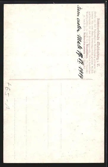 Personenbezogene Daten auf der Rückseite der Karte wurden durch blauen Textmarker unkenntlich gemacht. Die blauen Stellen sind auf die Vorderseite durchgeweicht und wirken sich negativ auf das Postkartenfoto aus