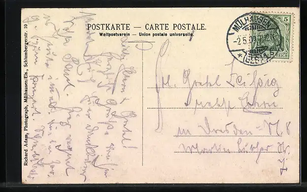 Personenbezogene Daten auf der Rückseite der Karte wurden durch blauen Textmarker unkenntlich gemacht. Die blauen Stellen sind auf die Vorderseite durchgeweicht und wirken sich negativ auf das Postkartenfoto aus