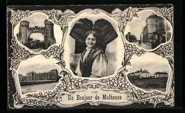AK Mulhouse, Burg, Ortspartie, Frau in Tracht