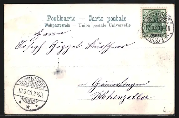 alte Ansichtskarte, gelaufen 1903, Eckknicke unten, Stempelspur, guter Zustand