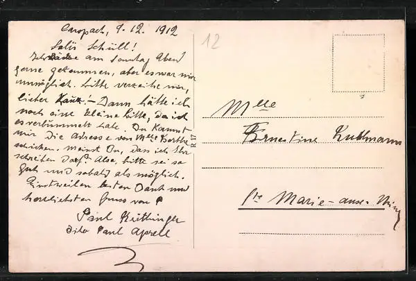 Personenbezogene Daten auf der Rückseite der Karte wurden durch blauen Textmarker unkenntlich gemacht. Die blauen Stellen sind auf die Vorderseite durchgeweicht und wirken sich negativ auf das Postkartenfoto aus