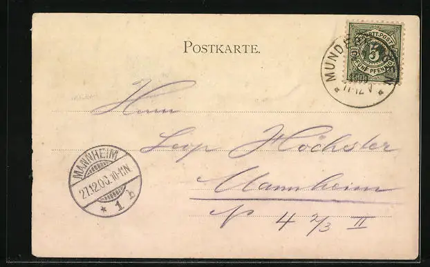 alte Ansichtskarte, gelaufen 1900, Abriebspur rechte Kante unten, guter Zustand