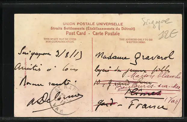 Personenbezogene Daten auf der Rückseite der Karte wurden durch blauen Textmarker unkenntlich gemacht. Die blauen Stellen sind auf die Vorderseite durchgeweicht und wirken sich negativ auf das Postkartenfoto aus