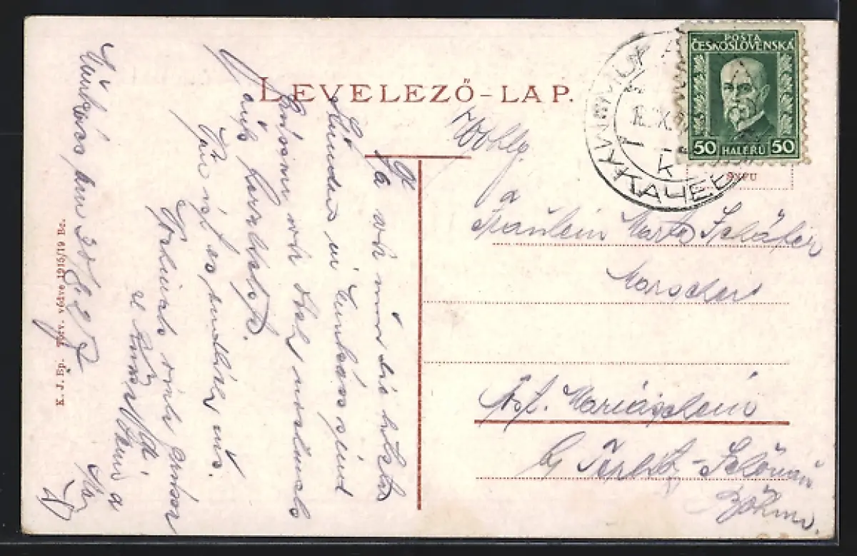 Personenbezogene Daten auf der Rückseite der Karte wurden durch blauen Textmarker unkenntlich gemacht. Die blauen Stellen sind auf die Vorderseite durchgeweicht und wirken sich negativ auf das Postkartenfoto aus