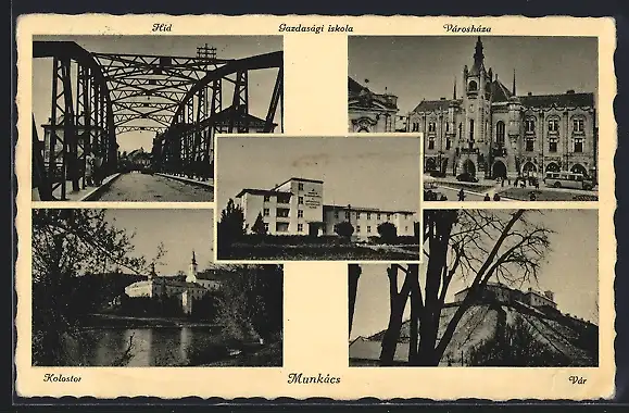 AK Munkács, Hid, Városháza, Vár, Gazdasági iskola