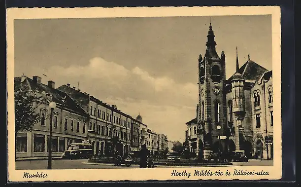 AK Munkács, Horthy Miklós-tér és Rákóczi-utca