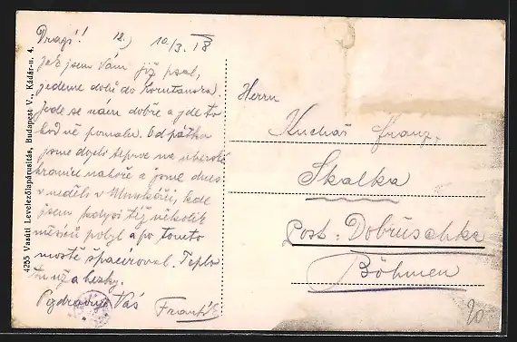 Personenbezogene Daten auf der Rückseite der Karte wurden durch blauen Textmarker unkenntlich gemacht. Die blauen Stellen sind auf die Vorderseite durchgeweicht und wirken sich negativ auf das Postkartenfoto aus