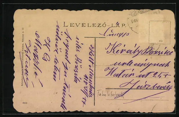 Personenbezogene Daten auf der Rückseite der Karte wurden durch blauen Textmarker unkenntlich gemacht. Die blauen Stellen sind auf die Vorderseite durchgeweicht und wirken sich negativ auf das Postkartenfoto aus