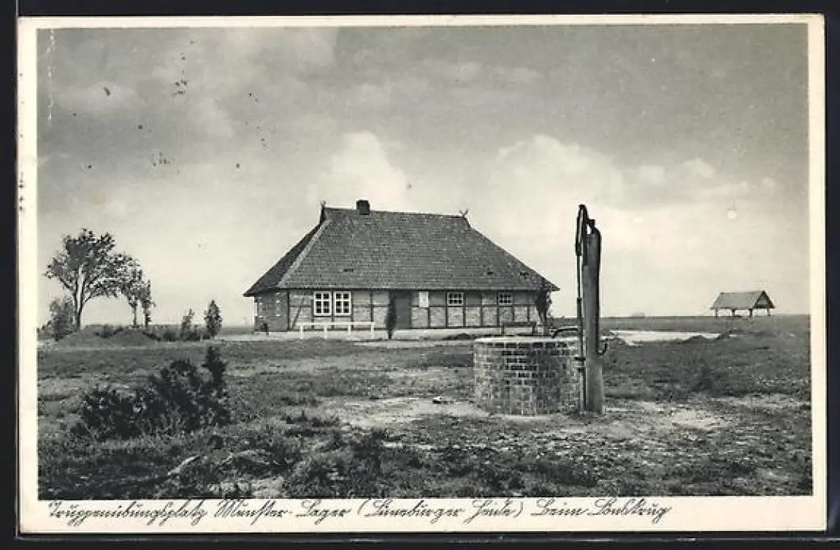 AK Munster-Lager /Truppenübungsplatz, Baracke, Brunnen, Schutzhütte