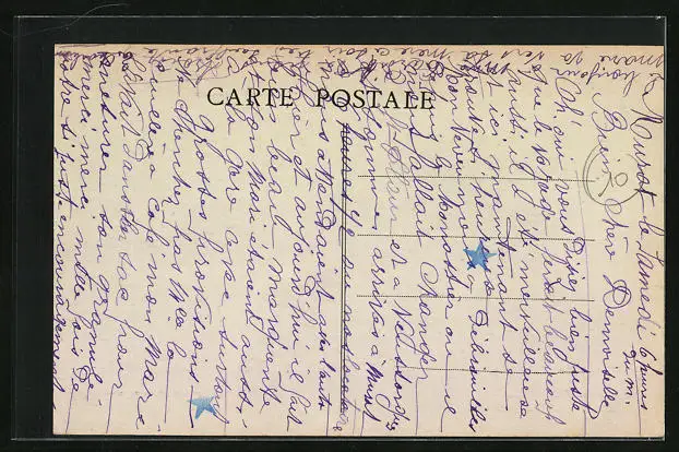 Personenbezogene Daten auf der Rückseite der Karte wurden durch blauen Textmarker unkenntlich gemacht. Die blauen Stellen sind auf die Vorderseite durchgeweicht und wirken sich negativ auf das Postkartenfoto aus