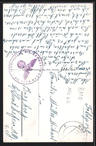 Personenbezogene Daten auf der Rückseite der Karte wurden durch blauen Textmarker unkenntlich gemacht. Die blauen Stellen sind auf die Vorderseite durchgeweicht und wirken sich negativ auf das Postkartenfoto aus