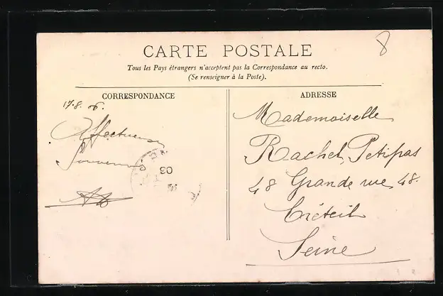 Personenbezogene Daten auf der Rückseite der Karte wurden durch blauen Textmarker unkenntlich gemacht. Die blauen Stellen sind auf die Vorderseite durchgeweicht und wirken sich negativ auf das Postkartenfoto aus