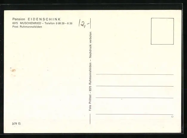 Personenbezogene Daten auf der Rückseite der Karte wurden durch blauen Textmarker unkenntlich gemacht. Die blauen Stellen sind auf die Vorderseite durchgeweicht und wirken sich negativ auf das Postkartenfoto aus