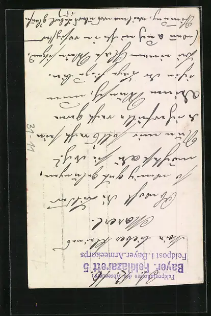 Personenbezogene Daten auf der Rückseite der Karte wurden durch blauen Textmarker unkenntlich gemacht. Die blauen Stellen sind auf die Vorderseite durchgeweicht und wirken sich negativ auf das Postkartenfoto aus