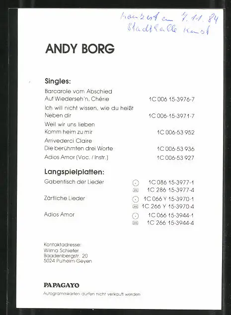 AK Musiker Andy Borg blickt in die Kamera. Autograph