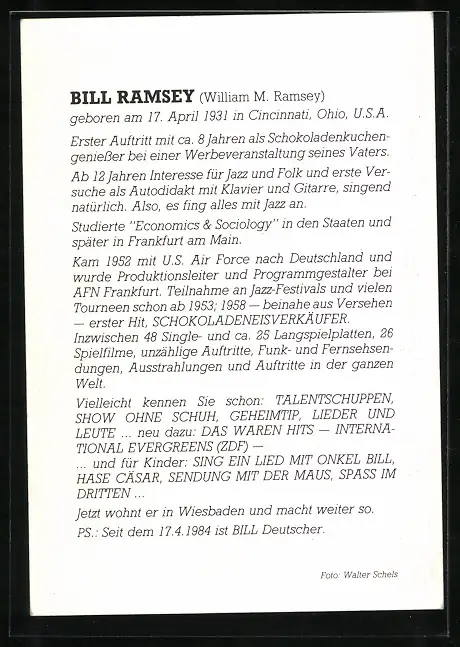 AK Musiker Bill Ramsey mit Brille und Bart, Autograph