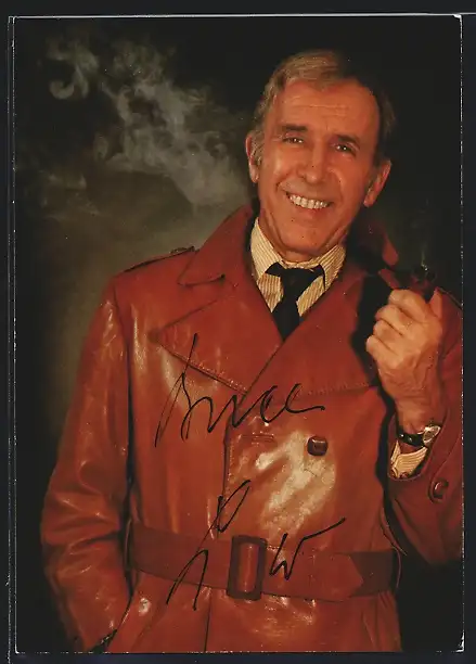 AK Musiker Bruce Low in Ledermantel mit Pfeife, Autograph