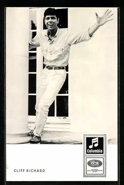 AK Musiker Cliff Richard in leichter Garderobe an einer Säule stehend