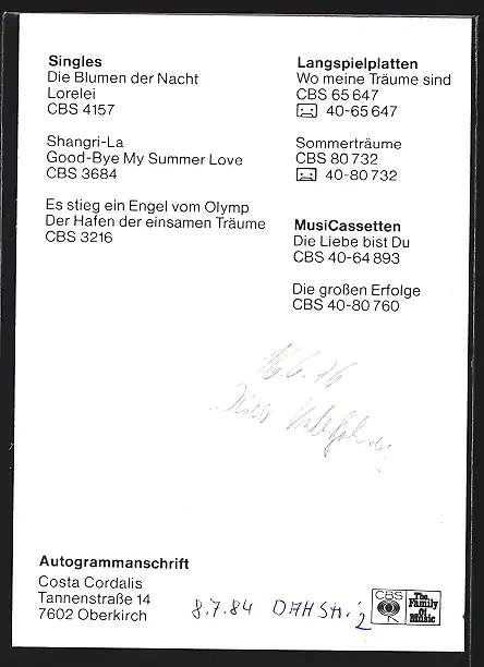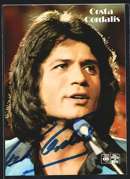 AK Musiker Costa Cordalis mit langem Haar am Mikrofon, mit Autograph
