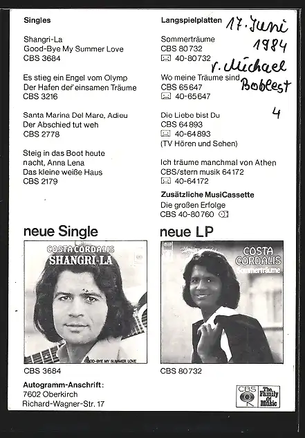 AK Musiker Costa Cordalis mit wallendem Haar und Gitarre auf der Schulter, mit Autograph