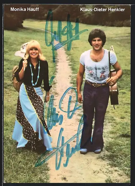 AK Musiker-Duo Hauff & Henkler mit ihren Instrumenten auf einem Feldweg, mit Autograph