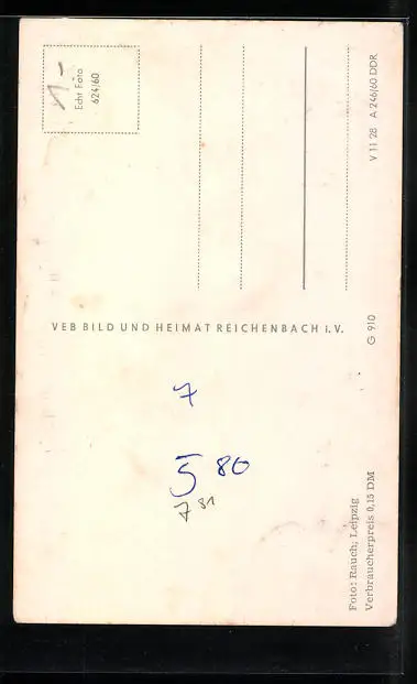 Personenbezogene Daten auf der Rückseite der Karte wurden durch blauen Textmarker unkenntlich gemacht. Die blauen Stellen sind auf die Vorderseite durchgeweicht und wirken sich negativ auf das Postkartenfoto aus