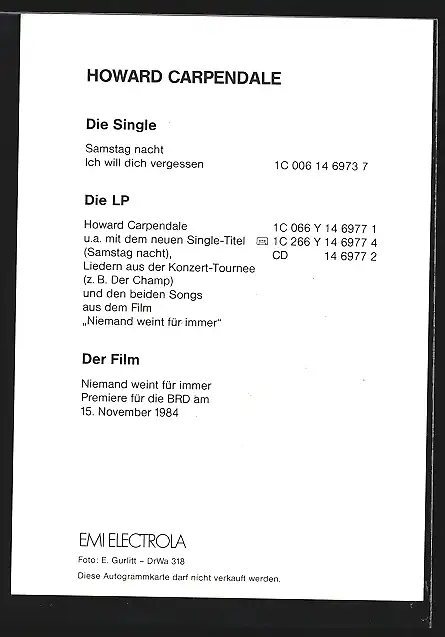 AK Musiker Howard Carpendale in Denkerpose, original Autograph
