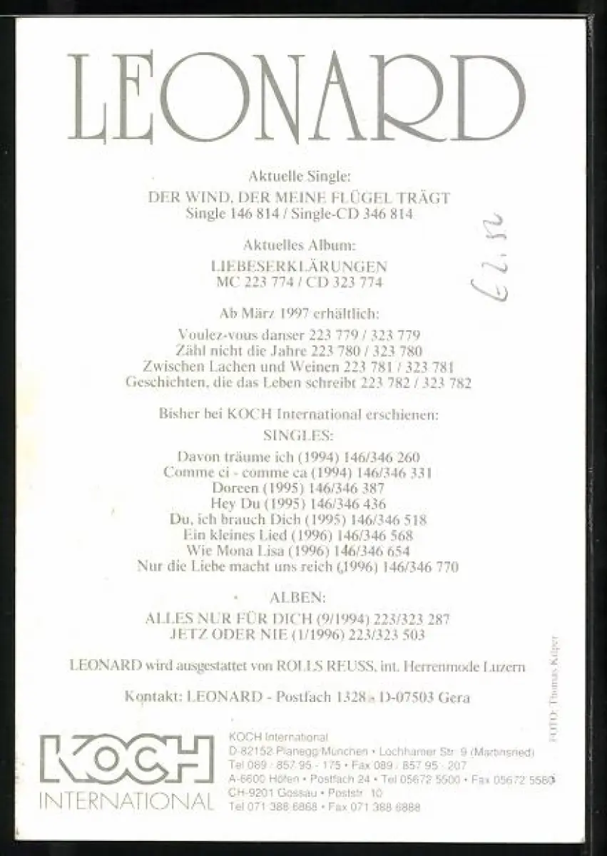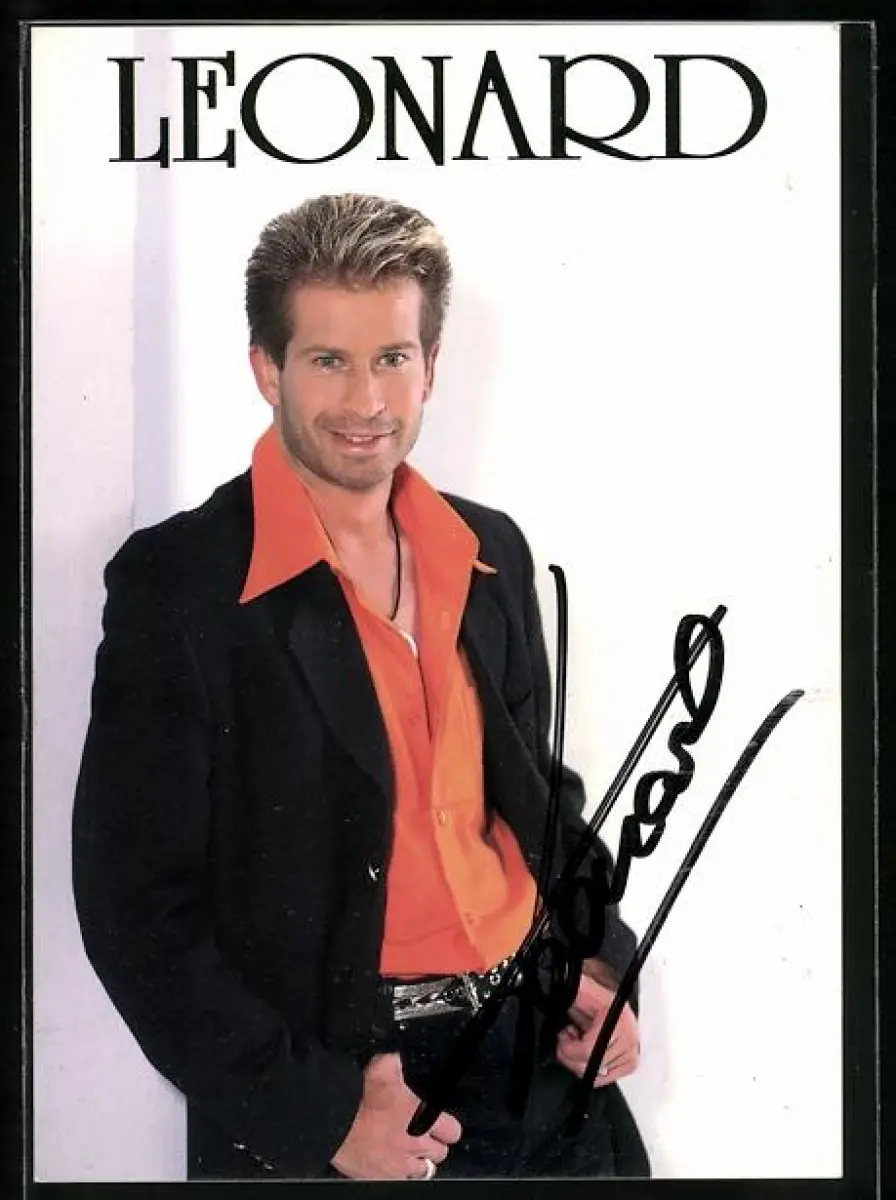 AK Musiker Leonard mit orangefarbenem Hemd, Autograph