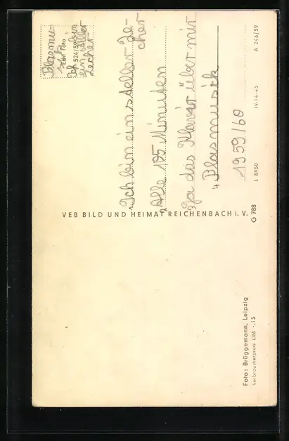 Personenbezogene Daten auf der Rückseite der Karte wurden durch blauen Textmarker unkenntlich gemacht. Die blauen Stellen sind auf die Vorderseite durchgeweicht und wirken sich negativ auf das Postkartenfoto aus