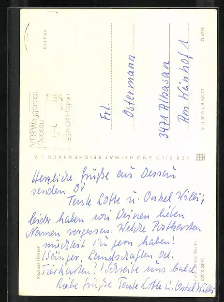Personenbezogene Daten auf der Rückseite der Karte wurden durch blauen Textmarker unkenntlich gemacht. Die blauen Stellen sind auf die Vorderseite durchgeweicht und wirken sich negativ auf das Postkartenfoto aus