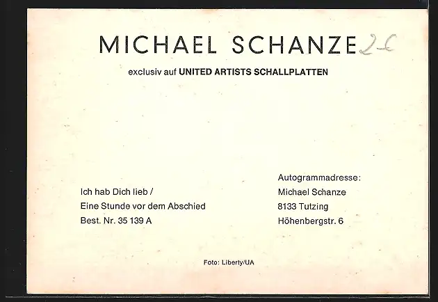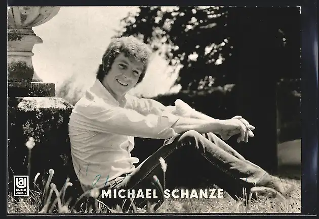 AK Musiker Michael Schanze lächelnd auf einer Wiese sitzend, mit Autograph