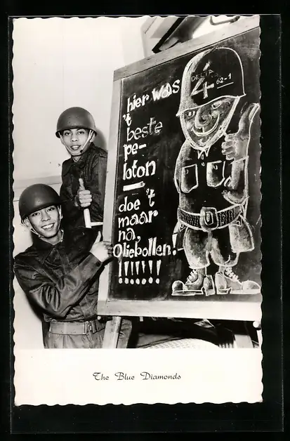 AK Musiker The Blue Diamonds in Uniformen an einer Tafel stehend