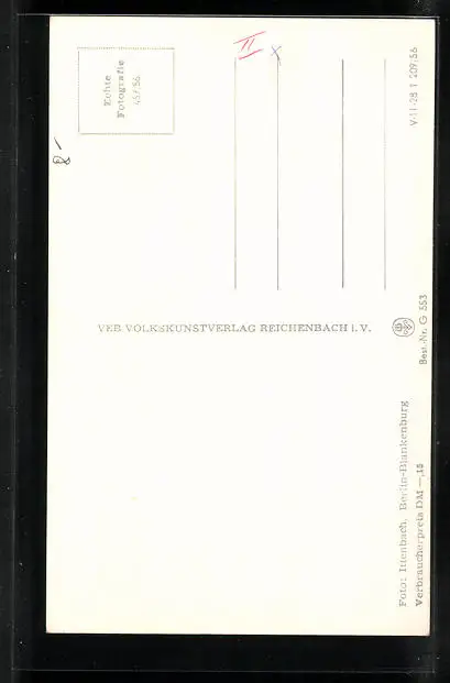 Personenbezogene Daten auf der Rückseite der Karte wurden durch blauen Textmarker unkenntlich gemacht. Die blauen Stellen sind auf die Vorderseite durchgeweicht und wirken sich negativ auf das Postkartenfoto aus