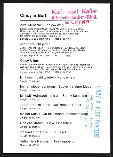 AK Musiker des Duos Cindy und Bert in inniger Pose, mit Autograph